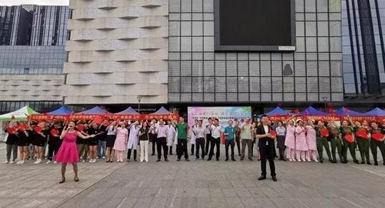 最后,现场的各位领导、演艺人员和工作人员从广场的四面八方“快闪”而来,齐唱国歌, 献礼祖国70华诞。