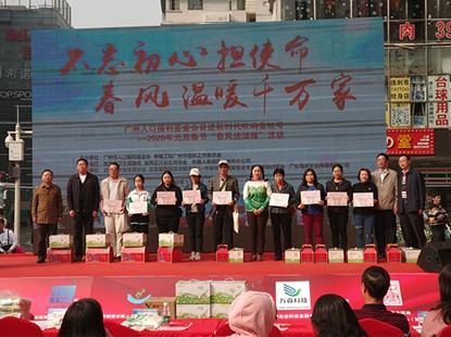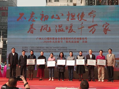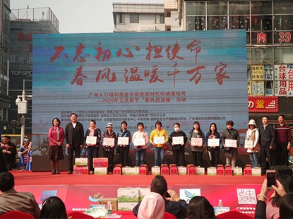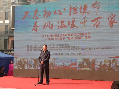 2020年1月4日上午,广州市人口福利基金会、幸福工程广州市组织工作委员会联合越秀区卫生健康局、越秀区计划生育协会、中国人寿保险广州市分公司和北京街计划生育协会、国家应急管理部宣传教育中心——中安传媒、广东海岸文化传媒有限公司共同举办“不忘初心担使命,春风温暖千万家”广州人口福利基金会奋进新时代吹响集结号——2020元旦春节“春风送温暖”大型广场帮扶慰问活动在越秀区北京街西湖路的广百文化广场举行。