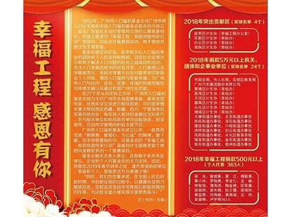 ★(十七)为进一步扩大我会的社会影响力及公众知晓度,并对广大机构和爱心群众在我会27年实际工作中,尤其在2018年的募捐工作中做出突出贡献的予以表彰奖励,在2019年1月23日广州日报要闻第5版刊登幸福工程专题鸣谢公告。广东卫生在线公众号于1月31日推送我会关于“春风送温暖”春节慰问活动的情况。其他省、市、区融媒体也及时给予了报道。