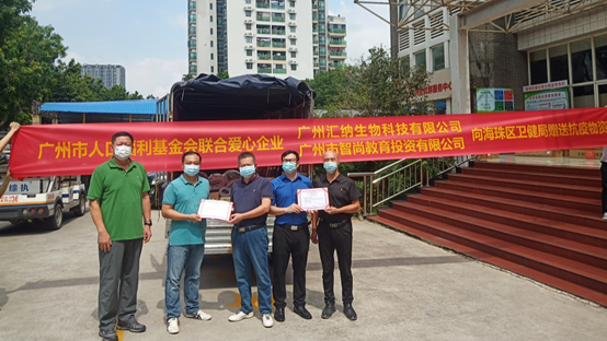 2021年6月9日广州市人口福利基金会联合爱心企业广州汇纳生物科技有限公司、广州市智尚教育投资有限公司向海珠区赠送两台消杀通道及抗疫物资陈李济次氯酸消毒液。