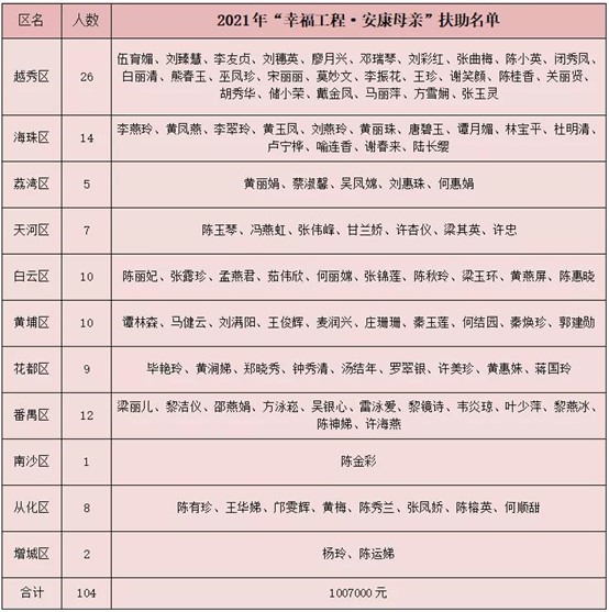 据统计,此次活动共帮助104位困境母亲,全市共发放扶助金共计1007000元。
