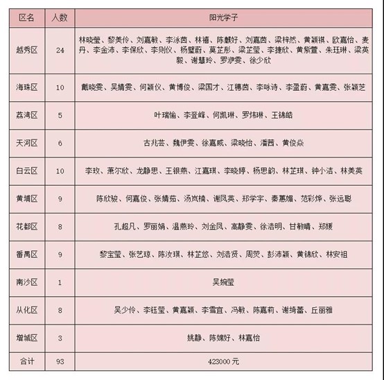 经受助人申请,村、居审查,街、区审核及市复审后,此次活动共帮助93位“阳光学子”,其中受助大学生每年助学金为5000元,受助高中生每年助学金为3000元,此次全市共发放助学金423000元。