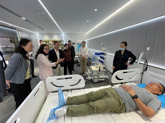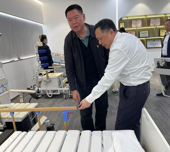 在孙元凯博士及相关人员的陪同下,段建华理事长现场参观了高配版AI协助失能护理机器人的运作过程,并对该设备高度认可的同时也对设备本身存在的不足提出了自己的意见和建议。